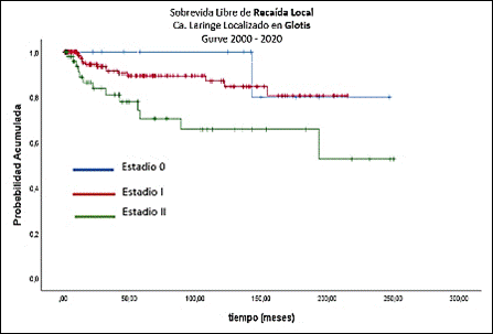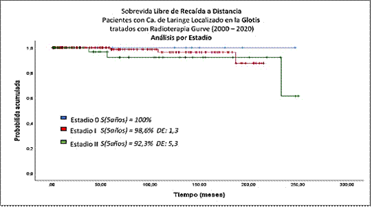 La sobrevida libre de progresión a distancia en estadios I de glotis fue de 98,6 % a los 5 años de seguimiento y para el estadio II fue mayor del 92 % a los 5 años.