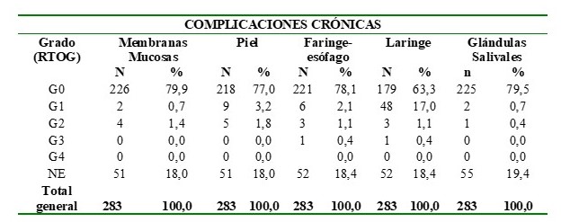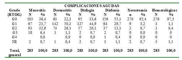 Las complicaciones agudas más prevalentes según la RTOG fueron: dermatitis grado I-II en el 76,3 %, mucositis grado I-II en 56,6 % de los casos y disfagia grado I-II en el 65 % de los pacientes, en cuanto a toxicidad de glándulas salivales y hematológicas la presentaron 11 y 4 pacientes respectivamente. La disfonía grado 4 solo se observó en 1 caso. De las complicaciones crónicas, la más común fue disfonía grado I en el 17 % de los pacientes, seguida por fibrosis de la piel grado I en un 3.4 % de los pacientes (Cuadro 3,4,
