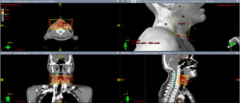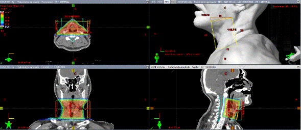 Inicialmente, la técnica de tratamiento radiante más utilizada fue puntual con planificación 2D mediante campos laterales opuestos y un tamaño de campo 5 cm x 5 cm en estadios 0-I (Figura 1) y en los estadios II se utilizó un tamaño de campo de 5 cm x 9 cm (Figura 2), posteriormente, se empleó la técnica de planificación tridimensional, con campos laterales opuestos delimitados a la laringe (Figura 3 y 4).