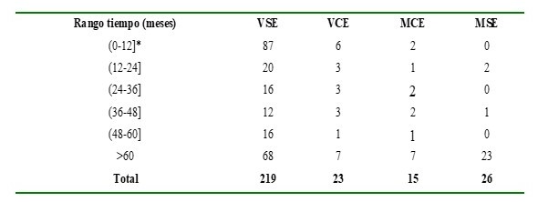 Para el momento del análisis 219 pacientes (80 %) se encontraban vivos sin enfermedad, 26 (9,1 %) fallecieron sin enfermedad y 15 pacientes (5 %) fallecieron con enfermedad (Cuadro 2), sin embargo, es importante destacar que un 33 % de la muestra presentó un seguimiento menor a 1 año por lo que se consideran perdidos de control.