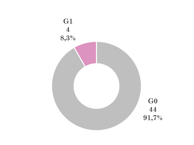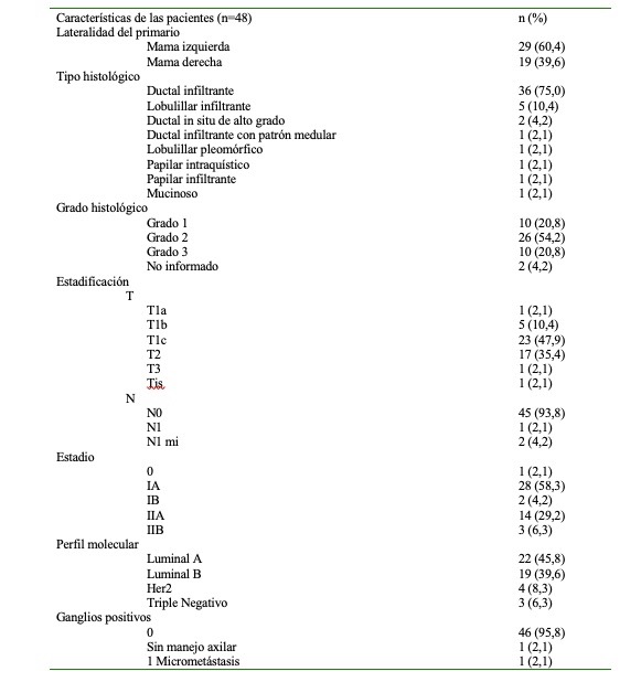 Se incluyeron un total de 48 pacientes en el estudio, de las cuales 41 (85,4 %) proceden de ONCORAD-CDD y 7 (14,6 %) del CDD. La edad media de las pacientes fue de 58 ± 11 años (rango: 37 - 80 años) y sus características iniciales (Cuadro 1) muestran mayor lateralidad en la mama derecha, carcinoma ductal infiltrante como tipo predominante y grado histológico 2. Para la estadificación, el tamaño tumoral más frecuentes fue T1c, seguido por T2, en su mayoría sin propagación a otros ganglios. El número de ganglios por paciente fue de 2,5 con rango entre 1 y 7, mientras que, en las cuatro pacientes con disección de ganglios, se contabilizaron un promedio de 12,2 con rango entre 8 y 18 ganglios. Ninguna paciente presentó metástasis (100,0 % M0). Los estadios predominantes fueron IA y IIA y los perfiles moleculares predominantes fueron Luminal A y B. Ninguna paciente mostró márgenes positivos, y tampoco se realizó preservación o reconstrucción de prótesis mamarias.