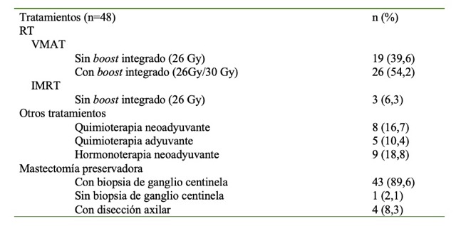 La RT fue administrada en 5 fracciones con o sin boost integrado concomitante (Cuadro 2). En 8 pacientes se aplicó quimioterapia neoadyuvante y en cinco de forma adyuvante, en dos de ellas se asoció terapia anti Her2 con Trastuzumab. En las pacientes que realizaron hormonoterapia neoadyuvante, 5 (10,4 %) utilizaron Letrozol, 2 (4,2 %) Anastrozol, 1 (2,1 %) usó Exemestane y 1 (2,1 %) Tamoxifeno.
