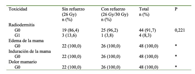 El uso de dosis de refuerzo en el lecho tumoral permite administrar una mayor dosis sin aumentar el número de fracciones de tratamiento. En este estudio, no se encontraron diferencias entre la toxicidad que experimentaron pacientes que recibieron un refuerzo de 30 Gy en el lecho tumoral, al compararlas con aquellas a las que no se les aplicó, lo cual fue consistente con otros estudios y mantiene la ventaja de realizar un tratamiento efectivo y sin efectos adversos severos sin incrementar el tiempo total de tratamiento.