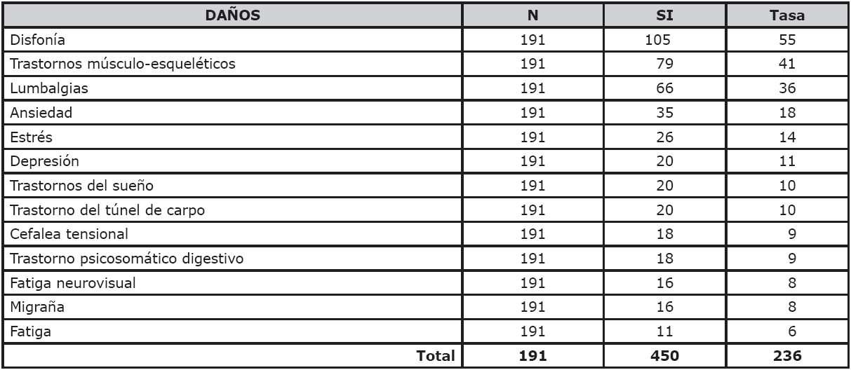 De manera generalizada, los daños a la salud más importantes son los trastornos musculoesqueléticos, lumbalgia y disfonía.