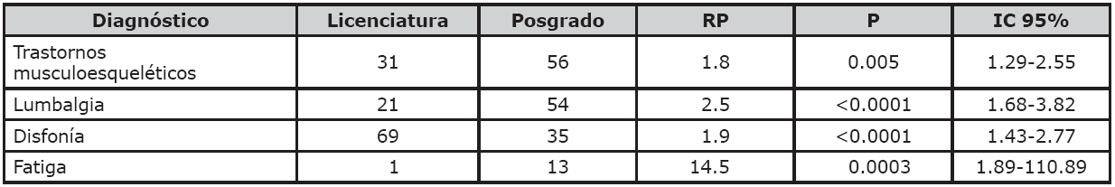 Muchos de los aspectos del trabajo docente, en relación con el rango académico se refleja en su estado de salud. La mayor parte de los académicos que tienen posgrado se dedican a tareas que tienen que ver más allá del aula de clases, que obligan a situaciones sedentarias y de escritorio, por ejemplo, hacer investigación, artículos, conferencias, planeación pedagógica, etc. Como se muestra en la Tabla N° 3 , en el caso de los trastornos musculoesqueléticos, quienes estudiaron posgrado tienen casi el doble de riesgo de presentar el daño que aquellos que han estudiado hasta nivel licenciatura. Un fenómeno similar sucede con la lumbalgia, aunque aquí el riesgo es de más del doble. No obstante, los docentes que tienen licenciatura dedican en general la mayor parte de su tiempo al trabajo en el aula, así que ellos tienen dos veces más riesgo de padecer disfonía que los académicos que tienen posgrado.