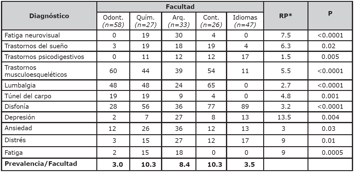 En la Tabla N° 4 se aprecia que las prevalencias más altas en fatiga neurovisual se encontraron en la Facultad de Arquitectura, donde la actividad de la propia carrera implica desvelos y trabajar en condiciones de mucha luminosidad. Las facultades de Ciencias Químicas y Contaduría y Administración tienen seis veces más trastornos del sueño que la Facultad de Odontología. La Facultad de Arquitectura presenta una prevalencia importante en la presencia de depresión, la Facultad de Idiomas en disfonía, Odontología en trastornos musculoesqueléticos. Las Facultades de Ciencias Químicas y de Contabilidad presentan las tasas de prevalencia más altas, tomando en consideración al conjunto de padecimientos.