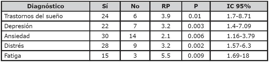 Fuente: Encuesta Individual para la Evaluación de la Salud de los Académicos, 2014Cabe resaltar que la investigación arrojó datos interesantes con respecto a la relación de tiempo que los académicos han tenido los estímulos, con una P=0.04 y un intervalo de confianza que va desde 1.17 hasta 4.37, aquellos que tienen menos de diez años trabajando tienen doble riesgo de lumbalgia que aquellos que tienen más de nueve años trabajando con el estímulo a la docencia. Para los maestros que reportan un deterioro en su vida familiar, social y laboral debido a su incorporación al programa de becas y estímulos, el riesgo de presentar trastornos del sueño es cinco veces más alto (P=0.0005, IC 95%= 1.25-20.44). Los que reportan que la calidad de su trabajo no ha mejorado debido a su participación en el programa de becas y estímulos, tienen un riesgo seis veces mayor de presentar fatiga (P=0.001, IC 95%= 1.25-28.74).