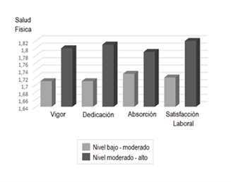 Por otro lado, ninguna de las dimensiones del work engagement observaron correlaciones estadísticamente significativas con la salud física (sólo la dedicación correlacionó de manera marginal), aunque sí lo hizo la satisfacción laboral (r = 0,22), revelando que aquellos docentes que reportan sentirse más satisfechos con sus trabajos tienden a gozar de una mejor salud física. Finalmente, y de manera consistente con lo esperado, las medidas de salud física y salud mental correlacionaron de manera positiva entre sí (r = 0,49), indicando que niveles más elevados de salud mental se hallan asociados con niveles mayores de salud física.