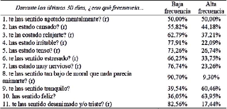 La salud mental fue examinada empleando una adaptación del General Health Questionnaire (GHQ; Goldberg, 1978), el cual se compuso por un total de 11 reactivos (ver Tabla 2) y una escala estilo Likert de 6 niveles de frecuencia (1 = “nunca”, 6 = “siempre”). Los puntajes indicados con la simbología “(r)” en la Tabla 2 fueron revertidos y re-expresados en términos positivos para que reflejen mayores niveles de salud mental.