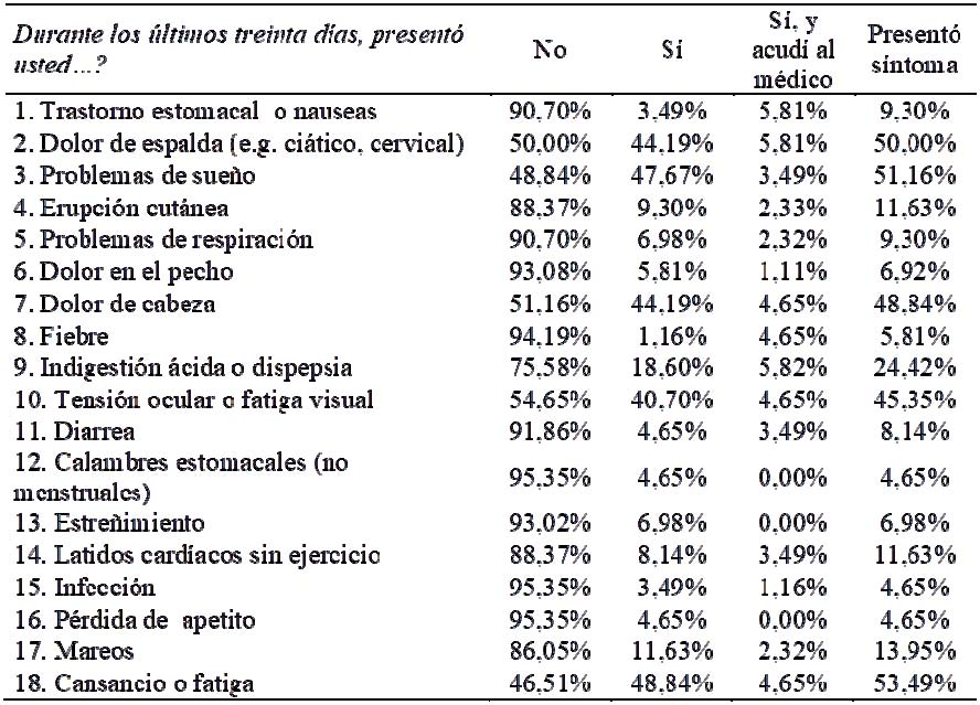 La salud física fue evaluada empleando la versión en español del Physical Symptoms Inventory (PSI; Spector & Jex, 1998), instrumento que examina el grado de presencia de 18 síntomas relacionados con la salud física durante un período de 30 días (ver Tabla 3) a través de una escala compuesta por tres valores (3 = “nunca”, 2 = “sí, pero no acudí al médico”, 1 = “sí, y acudí al médico”).