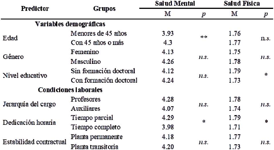Con el propósito de analizar la influencia de un conjunto de variables socio-demográficas (i.e. edad, género y nivel educativo) y otras relativas a las condiciones de empleo (i.e. jerarquía del cargo, dedicación horaria y estabilidad contractual) sobre los niveles reportados de salud mental y física, se realizaron pruebas de diferencia de medias, puntualmente la prueba t de Student (ver Tabla 4).