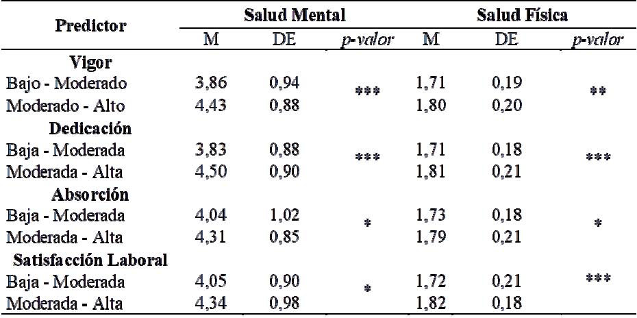 Con el propósito de analizar la influencia del work engagement y la satisfacción laboral de los docentes sobre sus niveles reportados de salud física y mental, nuevamente se empleó la prueba estadística de diferencia de medias t de Student. A tal fin, se procedió a separar a los docentes en dos grupos independientes según registren niveles de vigor, dedicación, absorción y satisfacción laboral por encima o por debajo de la media.