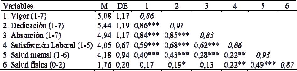En la Tabla 1 se reportan las medias, las desviaciones estándar y las correlaciones observadas entre las variables del estudio. Como puede observarse, los participantes reportan niveles promedio moderados a elevados de vigor, dedicación, absorción, satisfacción laboral, salud mental y salud física.