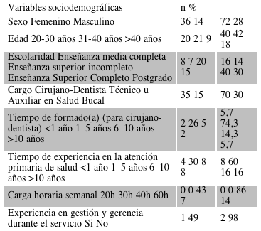 De un total de 84 profesionales consultados inicialmente, hubo una no respuesta del 40,5%, quedando conformada la muestra por 50 individuos para este estudio. Se notó una baja participación en la investigación en el grupo de TSB/ASB (35%) durante la recolección de datos, inclusive después de ser informados del anonimato de las respuestas, en comparación con la participación de los CD (85%). El perfil general de la muestra obtenida estuvo constituido por cirujanos-dentistas (70%), de los cuales el 40% generalistas y 30% con posgrado concluido o en curso, con 1-5 años de graduados (74,3%).Con respecto al sexo, la muestra estuvo constituida mayoritariamente por mujeres (72%), mientras que en relación a la edad, el 82% fueron individuos <40 años. Se observó también un predominio laboral general de 1-5 años de experiencia en los sistemas de atención de salud primaria (60%), con carga horaria semanal de 40h (86%) y sin funciones de gestión o gerencia (98%) (Tabla 1).