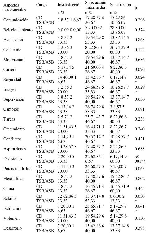 El análisis de los niveles de satisfacción en la escala OSI para cada aspecto psicosocial del trabajo mostró que los CD presentaban una mayor insatisfacción en la categoría seguridad (p<0,05), mayor satisfacción intermedia en la toma de decisiones (p<0,001) y menor satisfacción en cuanto al salario ya la estructura organizacional (p<0,05) con relación a los TSB/ASB. Por otro lado, los TSB/ASB presentaron mayor insatisfacción en cuanto a la identificación con la imagen externa o realizaciones que los CD (p<0,05) (Tabla 2).