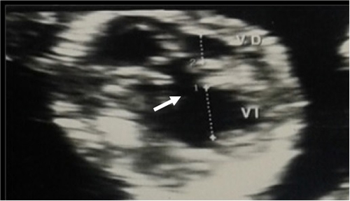 Es evaluada por Cardiología Infantil del Hospital Central “Dr. Enrique Tejera” el 28/03/2016, con embarazo de 25 semanas. Hallazgos: ICT 0,65. Dominancia de cavidades derechas VD y AD, no se detecta derrame pericárdico, foramen oval amplio de 7,4mm. Válvula tricúspide, se capta insuficiencia pulmonar con gradiente pico 1,66m/seg. Septum interventricular defecto septal ventricular de 3mm, Anatomía pulmonar dilatada, arcos aórtico y ductal normal. Diagnóstico: Cardiopatía congénita agenesia de válvula pulmonar con CIV pequeña. Sin evidencia de arritmias cardiacas.