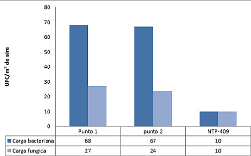 Los valores promedios obtenidos del recuento bacteriano en aire, a través de UFC/m3, fue de 68 UFC/m3 para el punto 1 y de 67 UFC/m3 para el punto 2. En cuanto a la carga fúngica se determinó un promedio de 27 UFC/m3 y 24 UFC/ m3 respectivamente (Figura 1).