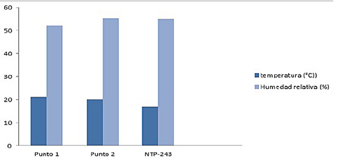 Con respecto a la temperatura, se determinaron valores de media superiores a 20ºC, lo cual se encuentra fuera del valor referencial que señala la NTP-243 (<18°C). A pesar de contar con un buen sistema de climatización es imprescindible la correcta utilización del mismo, estableciendo hábitos como el de mantener las puertas cerradas y limitar la entrada y salida constante de personas. Otro parámetro importante es la humedad relativa, la cual juega un papel importante siendo, además de la temperatura, un factor predisponente en la proliferación de microorganismos. Los valores de media obtenidos con respecto a la humedad relativa si cumplen con la NTP-243 la cual sugiere un rango de 50% a 60%, este resultado coincide con el de Izzeddin y col 2011, los cuales realizaron un estudio analizando las áreas críticas de 6 centros de salud, aun cuando obtuvieron valores de temperatura por encima de 18ºC, 5 de los 6 centros en estudio arrojaron valores de humedad relativa dentro del rango establecido por la NTP-243 (3).