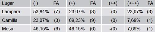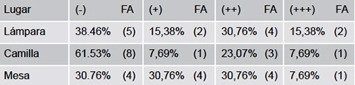 El crecimiento bacteriano en superficie fue más significativo en la camilla (69,23%), así como también la mesa de faena, con un porcentaje de crecimiento de 46,15%. Es importante destacar, que en un 53,84% del área superficial muestreada de la lámpara no se evidenció crecimiento (Tabla 1).