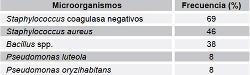 Identificación de bacterias y hongos. Se estudiaron las características macroscópicas del crecimiento de las colonias microbianas sobre las placas. Para identificación bacteriana: La caracterización microscópica se realizó a través de la técnica de coloración Gram y utilizando pruebas bioquímicas manuales (21) y posterior confirmación por Sistema Automatizado API-20E. Se identificaron los microorganismos aislados con un 98,9% de confiabilidad.