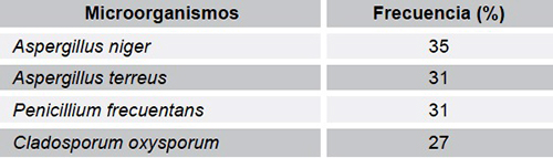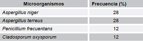 Análisis de los resultados. Los valores de las UFC/m3 de aire, temperatura y humedad relativa en el área se expresaron como media ± desviación estándar. Los microorganismos aislados en la superficie se presentaron de forma cualitativa, y expresados por frecuencias relativas y absolutas. La información procesada se presentó en tablas y gráficos Lla calidad microbiológic se realizó tomando como criterios los valores de las normas técnicas de prevención (NPT-409 y 243) de origen español.