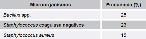 En relación a los microorganismos aislados, se puede analizar que en el caso de Staphylococcus coagulasa negativos han sido reportados como agentes etiológicos de bacteriemias relacionadas a contaminación de catéteres, abscesos superficiales, infecciones en piel, tejidos blandos e infecciones urinarias y post-quirúrgicas (14). Cabe destacar, este grupo de bacterias se aislaron con mayor frecuencia en superficies y aire, coincidiendo con Torres (2013) en un estudio realizado en el quirófano de un centro de salud ubicado en Ecuador(15).