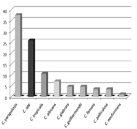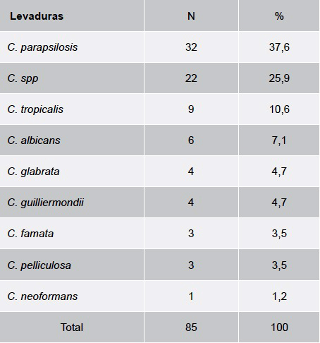 Las candidemias no albicans constituye hoy día, la principal incidencia nosocomial en el país y en la región, siendo C. parapsilosis la más frecuente en sangre. Algunas levaduras presentan resistencia intrínseca a un tipo de droga o desarrollan resistencias adquiridas o secundarias, por esta razón, se hace necesario su adecuada identificación a nivel de especie y el conocimiento de su distribución en los servicios hospitalarios, por lo que una de nuestras limitaciones fue la falta de recursos para el estudio de susceptibilidad a los antifúngicos en nuestras cepas evaluadas.