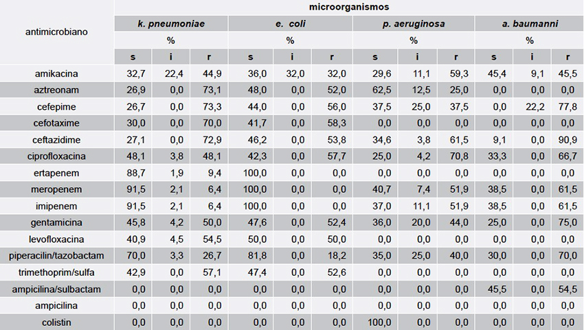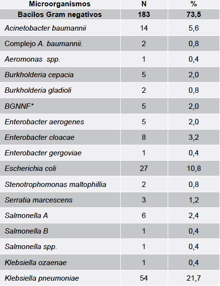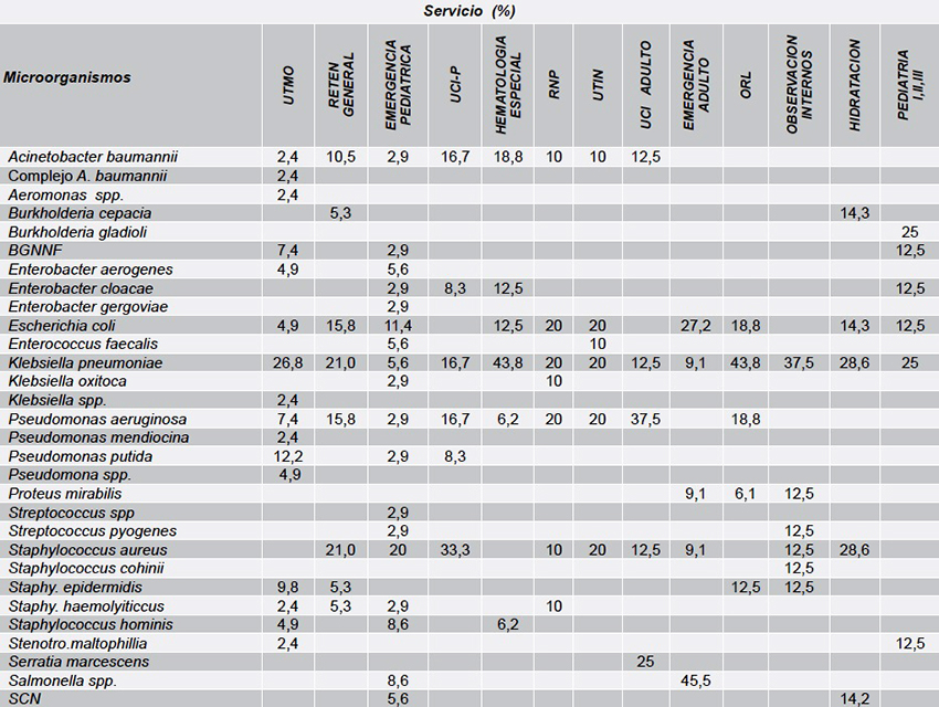 En conclusión, el principal grupo de microorganismos asociados a bacteriemias en los servicios de salud del hospital, fueron los bacilos Gram negativos Klebsiella pneumoniae, Pseudomonas aeruginosa, Escherichia coli y Acinetobacter baumanni. La resistencia de las enterobacterias es de gran importancia en la región, particularmente por la difusión de betalactamasas de espectro extendido (BLEE) y de tipo cefotaximasa (CTX-M). Entre los bacilos Gram negativos no fermentadores, las cepas de Pseudomonas aeruginosa y Acinetobacter baumannii, siguen siendo la causa principal de bacteriemias. El incremento de la resistencia de estos microorganismos a los antimicrobianos constituye un problema relevante, siendo primordial su aislamiento en los servicios de las Unidades de Cuidados Intensivos (UCI), y de neonatos y la aplicación de planes o medidas de control de enfermedades nosocomiales que permitan disminuir la morbi-mortalidad.