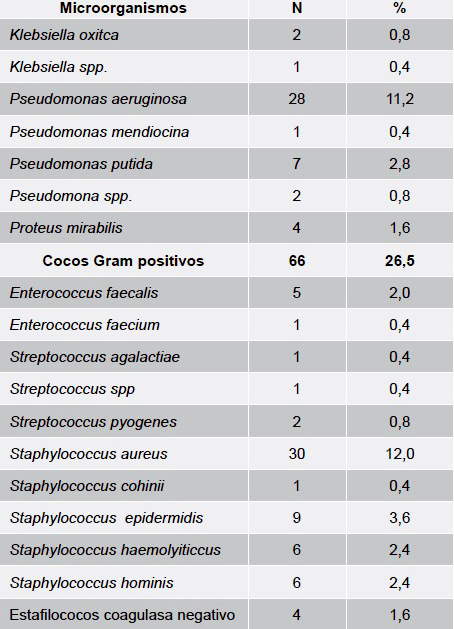 La cantidad diagnóstica de pacientes con septicemias fue de 334 (10,2%), distinguidos en dos grupos: bacteriemias (249) y fungemias (85), (tablas 1 y 2, Figura 1).