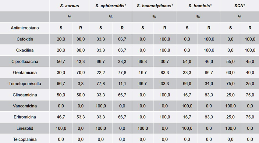 S: Sensible. R: Resistente. SCN: estafilococos coagulasa negativa, * CM