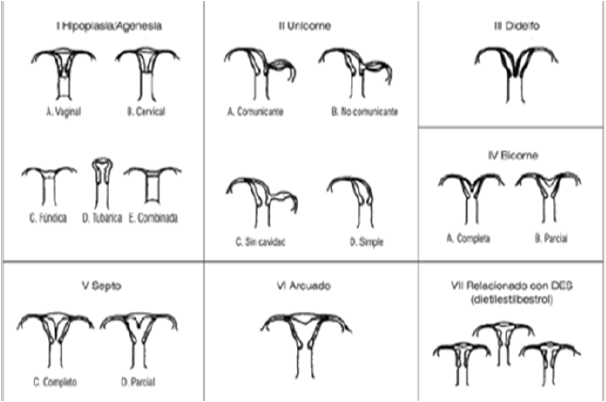 Clasificaciòn de las malformaciones mullerianas. Estas alteraciones pueden agruparse según características clínicas y tipo de defecto embriológico; como lo propuso la Sociedad Americana de Medicina Reproductiva (ASRM) en 1988, ordenándolas en siete categorías con sus respectivas subdivisiones (Fig. 1) (3,6).