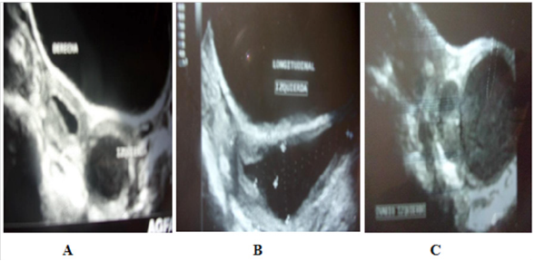 El primer caso corresponde a adolescente de 10 años y 5 meses de edad, quien es referida de pediatría para evaluación ginecológica por presentar tumoración quística gigante (180 cc aprox.) para uterina derecha en evaluación ecográfica pélvica previa, asociada a dolor pélvico tipo cólico hipogástrico de fuerte intensidad de 3 meses de evolución y resultados de marcadores tumorales Ca 125; Ca 19,9; α feto proteína; CEA y Subunidad β de HcG normales, al examen físico se observan mamas y distribución de vello pubiano III (S3/P3 según escala madurativa de Marshall y Tanner); abdomen blando, deprimible y doloroso a la palpación profunda debido a tumoración visible en hipogastrio y fosa iliaca derecha con genitales externos de aspecto y configuración normal e himen intacto, encontrándose al tacto bimanual (abdomino rectal) tumoración palpable renitente dolorosa correspondiente a cilindro útero vaginal distendido; se realiza ecografía pélvica transabdominal que revela presencia de dos úteros ambos con endometrio en su interior en proyección transversa se observa imagen quística retrovesical y ovario derecho con morfología normal; al rotar el transductor en proyección sagital se evidencia una imagen quística (89 cc) que se continua con cuerpo uterino derecho correspondiéndose esta con segmento vaginal derecho distendido (hematocolpos) y ovario izquierdo normal además de agenesia renal derecha y riñón izquierdo de morfología normal ( Fig. 2).
