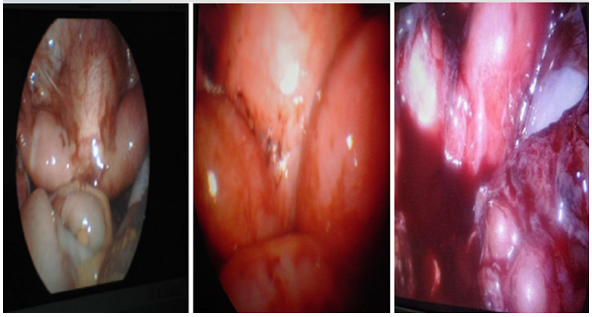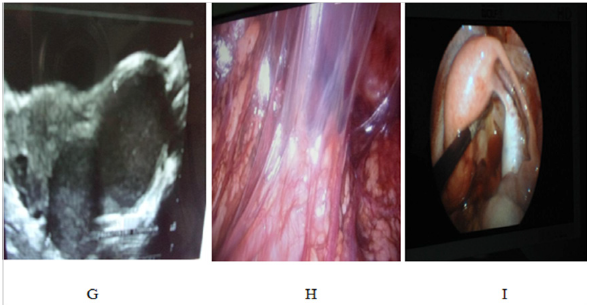 En los tres casos se realizó hemivaginectomia más drenaje de tumor por colección a nivel del segmento vaginal obstructivo y resección del tabique vaginal longitudinal dejando un solo canal vaginal previo abordaje laparoscópico que confirmo presencia de útero didelfo con contenido hemático abundante, libre en cavidad pélvica (hemoperitoneo) y focos de endometriosis, además de hematosalpinx y síndrome adherencial (Fig. 5), permitiendo así por vía laparoscópica corregir las complicaciones asociadas.