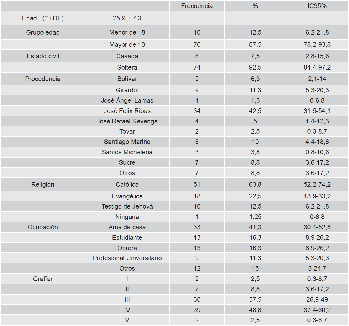 Desde el punto de vista demográfico, en la tabla 1 las 80 pacientes entrevistadas la edad promedio fue 25,9, 87,5% resultó ser mayor de edad, 34 (43,5%) procedentes del municipio José Félix Ribas, la mayoría (51%) de religión católica. E cuanto a su ocupación 33 (41,3%) Ama de casa, el estrato social predominante según la escala de estratificación social de Graffar (12) en pobreza crítica 39 (48,8%).