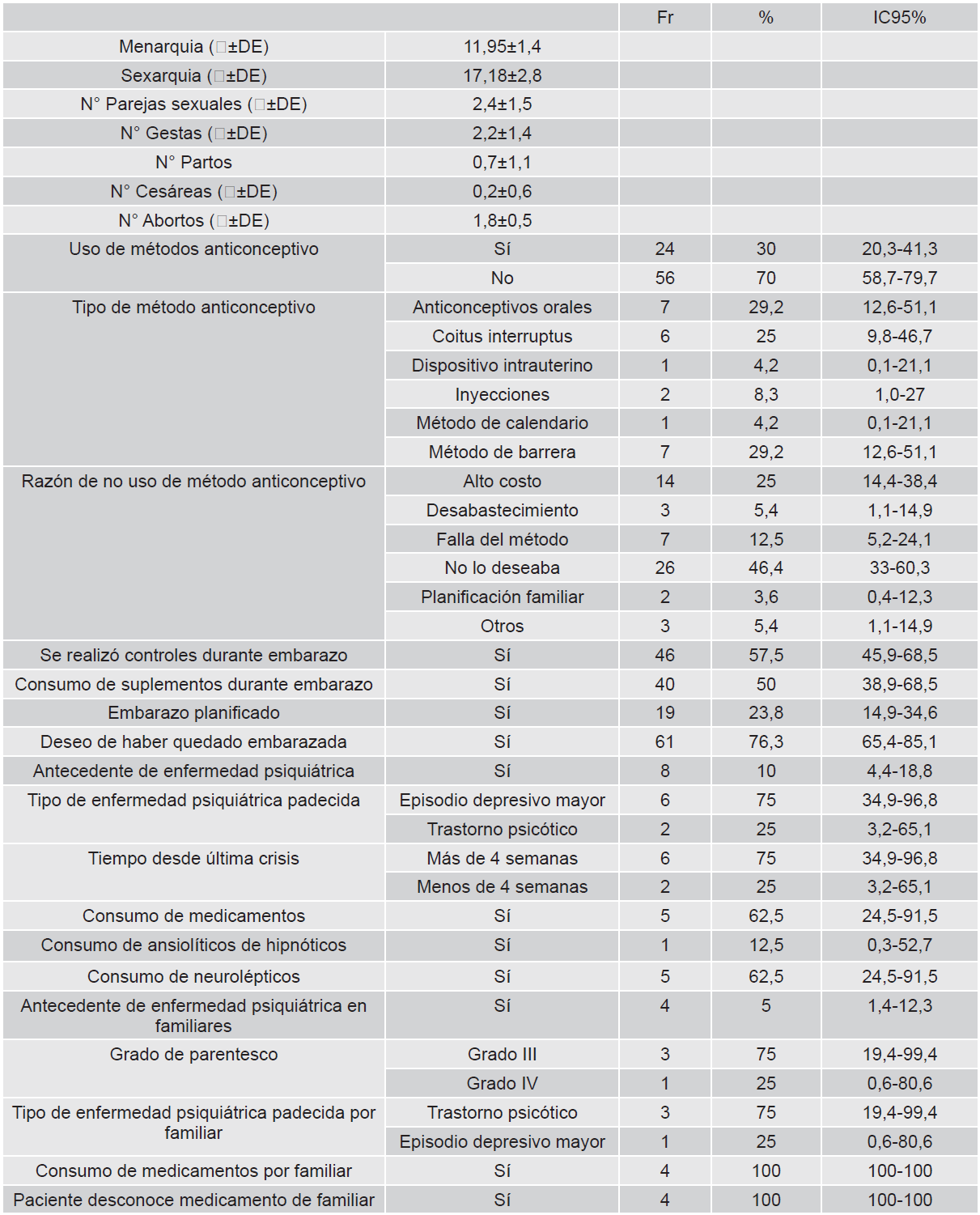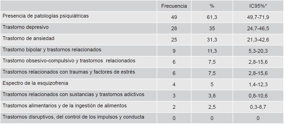 De nuestra muestra, 8 pacientes (10%) tenían antecedentes psiquiátricos personales, de las cuales 6 (75%) tenían diagnóstico de episodio depresivo mayor, de éstas, sólo 5 (62,5%) manifestaron recibir tratamiento y 4 pacientes (5%) con antecedentes familiares.