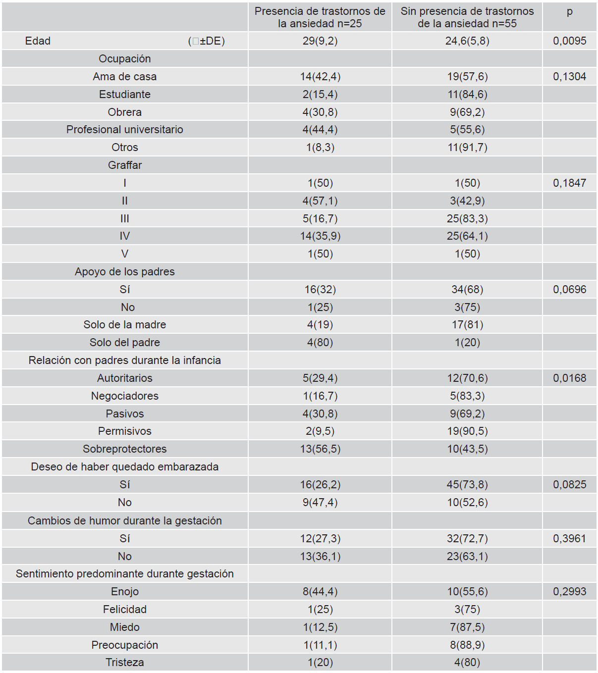 En segundo lugar, los TA (trastorno de ansiedad generalizada, agorafobia, fobia social, trastorno de pánico) representaron 31,3% de la muestra, siendo más frecuente en mujeres cuya edad media fue 29 años (intervalo p 0,0095), en comparación con las pacientes sin trastorno, con edad media 24,6 años. En la esfera sociodemográfica, 44,4% desempeñaban como amas de casa y 42,4% eran profesionales universitarias con predominio de la clase social II, 57,1%, en relación con los resultados obtenidos por Parreira et al. (6), la edad media fue 33 años, de las cuales 55,7% desempeñaban actividades domésticas.