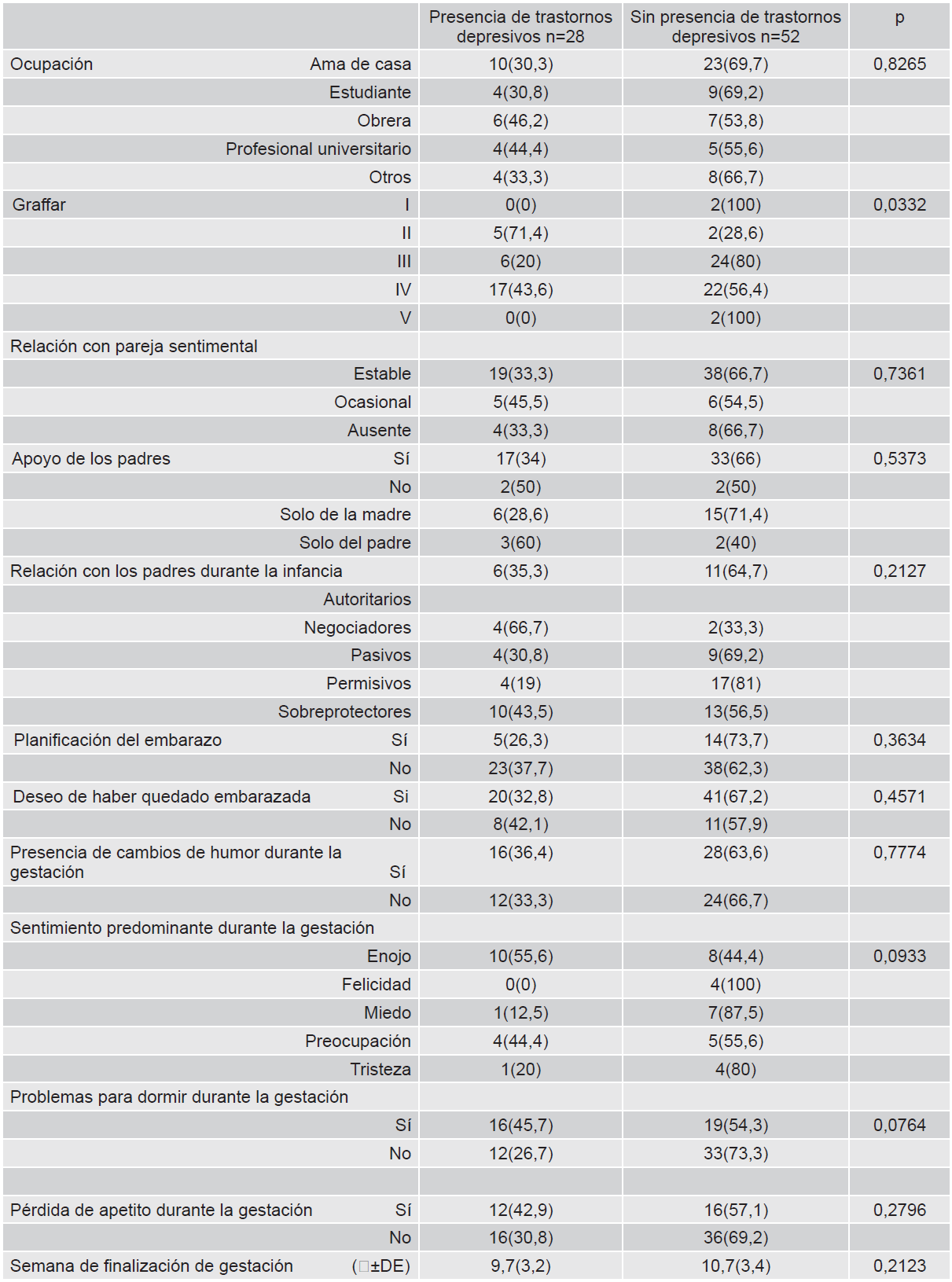 La tabla 6 permite observar en el perfil de ocupación de las 28 pacientes con TD, 35,7% eran ama de casa. En cuanto al estrato socioeconómico y TD, predominaron las pacientes pertenecientes a clase IV 60,7%. En contraposición, 5 (71,4%) de Graffar II presentan TD. En la relación con pareja sentimental, las que referían relación ocasional representaban 45,5%. Asimismo, el apoyo de los padres, de las pacientes que sólo recibieron apoyo paterno 60% presentó TD, y con respecto a las que no recibieron apoyo de ninguno de los dos padres el 50% presentó dicho trastorno. Por otra parte, las que refirieron padres sobreprotectores 10 (43,5%) presentaban TD.Adicionalmente 23 (82,1%) de las pacientes que no planificaron su embarazo presentaron TD. De las pacientes que presentaron TD, 57,1% manifestaron cambios de humor durante el embarazo, el humor predominante fue el enojo, 10 (62,5%) casos. 16 pacientes (57,1%) con TD manifestaron problemas para dormir y 12 (42,8%) pérdida de apetito. La media de semana de finalización de la gestación en pacientes con TD fue 9,7 en contraste, 10,7 de las que no presentaron dicho trastorno.