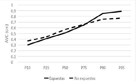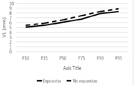La Figura 5 muestra que ambas poblaciones de expuestas y no a aumentos ponderales en el embarazo se comportan de manera parecida en su distribución en percentiles en los VL. Incluso en el grupo de expuestas el valor es inferior que el grupo no expuesto. Se infiere que la medición de los VL no se altera con el aumento exagerado de peso gestacional.
