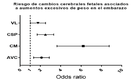 Se aprecia que el AVC, CM, CSP tienen razón de probabilidades (OR) con intervalos de confianza que no se superponen a la unidad, siendo estadísticamente significativos con valores de p menores de 0,05; lo cual asocia el aumento exagerado de peso gestacional como factor de riesgo para presentar cambios en las estructuras cerebrales antes nombradas con valor estadístico.