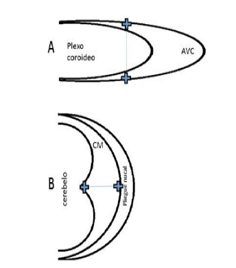 A lo largo de la evaluación sistemática del neurocráneo durante el segundo trimestre se ha descrito que el AVC es una estructura plástica que aumenta o disminuye su tamaño ante cambios del peso materno evidenciables en el control prenatal (16), y ordinariamente tiene valores menores de 1 cm cuando no hay malformaciones anatómicas válidas que alteren el tamaño de los ventrículos. Este fenómeno de plasticidad del AVC no se ha evidenciado en otras estructuras medibles como el CSP o en los mismos VL en cortes ecográficos más apicales (17). Esto hace sospechar que el AVC, y probablemente las demás estructuras que contienen líquido cefalorraquídeo, podrían reflejar el equilibrio metabólico materno ante cambios exagerados de peso gestacionales. Esta observación llevaría implicaciones médicas importantes, por cuanto estos niños nacen sin alteraciones anatómicas reconocibles por el equipo médico, puntuaciones APGAR normales al nacer y evolución neuropsicomotora neonatal normal en su primera infancia, pero con un riesgo teórico de padecer enfermedades del adulto. Estas estructuras parecen tener un papel protagónico en la fisiopatología del autismo, depresión, bipolaridad e incluso enfermedades degenerativas como el Alzheimer o Parkinson. (18,19,20)