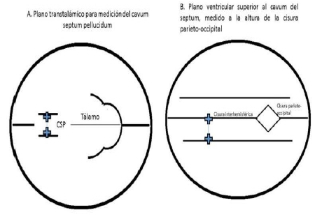 c.Las estructuras evaluadas se realizaron según las recomendaciones de la ISUOG en los cortes de consenso a través de la evaluación básica del SNC fetal y el neurosonograma fetal, (12,13,38) a saber: para la evaluación del DBP y la CC el plano craneal axial transtalámico (figura 1). Para la medida del AVC se realizó la medida en el plano axial transventricular (figura 2-A). Para la medida de la CM se realizó la medida en el plano axial transcerebelar (figura 2-B). El CSP se midió en el plano transtalámico en sus bordes mediales (figura 3-A). Para la medición de los VL (figura 3-B) en su porción súpero - anterior se realizó un plano accesorio axial no reportado en el consenso de la ISUOG, ubicado superior al CSP, paralelo al plano transtalámico, en donde se aprecian las tablas craneales, la cisura interhemisférica en cuya parte posterior se evidencia la cisura parieto occipital y a ambos lados de ella los VL, medidos con el caliper antes dicho desde el borde interno del ventrículo distal hasta la cisura interhemisférica, tal como se aprecia en la figura 4. Todas las medidas se realizaron con exactitud de 0,1 mm.