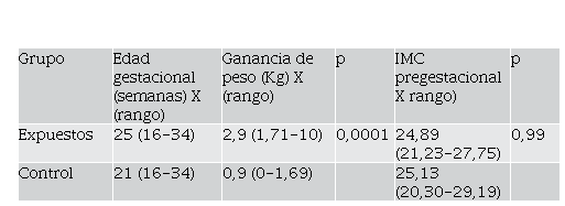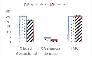 En la Fig. 1 se aprecia que la diferencia entre grupos es más evidente en el aumento del peso, más no en el IMC en el que incluso el grupo de no expuestos tuvo valores mayores.