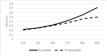 En la Figura 3 se puede observar la distribución percentilar en la CM, donde se ve una diferencia en la distribución entre las pacientes expuestas a aumentos exagerados de peso y aquellas que no estuvieron con dicho estímulo. Esta estructura presentó mediciones mayores a partir del percentil 50 en el grupo sometido a incremento excesivo de peso en la gestación.