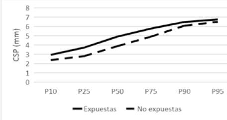 El CSP tiene una distribución similar en el grupo de expuestas y no expuestas a aumentos ponderales durante la gestación, siendo mayor la distribución en el grupo de las expuestas en todos los segmentos percentilares. (Fig. 4)