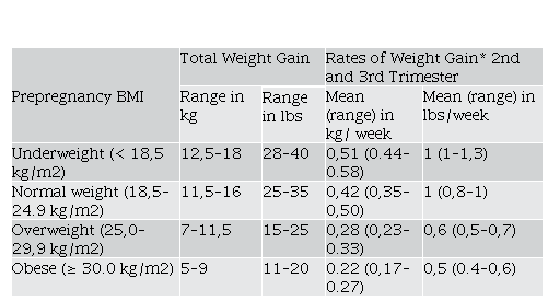 *Calculations assume a 0.5–2 kg (1.1–4.4 lbs) weight gain in the first trimester (based on Siega-Riz et al., 1994; Abrams et al., 1995; Carmichael et al., 1997). Copiado de: Weight Gain During Pregnancy: Reexamining the Guidelines. Copiado de: Institute of Medicine (US) and National Research Council (US) Committee to Reexamine IOM Pregnancy Weight Guidelines; Rasmussen KM, Yaktine AL, editors. Washington (DC): National Academies Press (US); 2009. Copyright © 2009, National Academy of Sciences.
