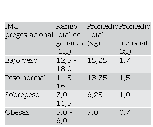 Esta tabla permite dar la orientación nutricional adecuada durante el control prenatal. Se tomará como normal la ganancia de peso mensual de 1,7 kg.