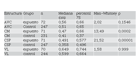 La Tabla 4 compara las medianas en las estructuras que conforman el sistema ventricular cerebral fetal, en cuyo interior se contiene líquido cefalorraquídeo, observándose una diferencia estadísticamente significativa en las mediciones de la CM y CSP de los grupos expuestos y control con valor de p estadísticamente significativa.