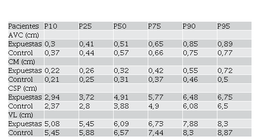 En la Tabla 5 se observa la distribución de percentiles que en promedio se obtuvieron en todas las edades gestacionales para cada estructura estudiada, donde se aprecia que el grupo de expuestas a aumento exagerado de peso tienen valores de sus percentiles mayores en la CM y CSP que en el grupo control, con leve aumento posterior del percentil 75 en el AVC. Los VL no mostraron mayor diferencia en cuanto a valores de los percentiles totales. En estos percentiles totales no se discriminó por edad gestacional, sino que se observa el comportamiento percentilar en los grupos expuestas y sus controles.
