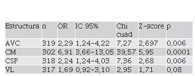 Una vez organizados los percentiles de todas las cuatro estructuras estudiadas, se consideró un cambio cerebral fetal mínimo aquel cuyo percentil se ubicó por encima del percentil 75, por lo que se organizan los datos con tablas de contingencia de 2 x 2 para expresarlos de la siguiente manera: Expuestas con percentil mayor del 75 y con percentil menor del 75 (sin cambio en la estructura), y no expuestas con percentiles mayor del 75 y con percentiles menores del 74,9. De esta manera se obtienen los valores de probabilidad de sucederse dichos cambios en las diferentes estructuras tal y como se aprecia en la Tabla 6, donde podemos observar que tanto el AVC, CM y CSP tienen ORs de 2,299 (IC 95% 1,24-4,22); 6,21 (IC 95% 3,66-13,05) y 2,24 (IC 95% 1,24-4,03) respectivamente, con sus cálculos de p < 0,05. Los VL tienen un OR de 1,69; pero con IC 95% 0,92-3,10 y con cálculo de p que no obtiene significancia estadística, observable también en la fig.6.