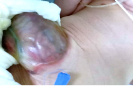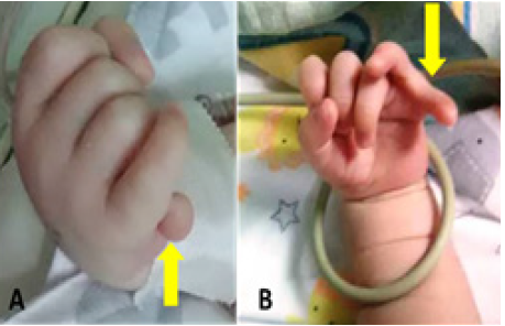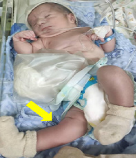 Se continuó control por la unidad de perinatología y a las 39 semanas se interrumpe la gestación a través de cesárea segmentaria por indicación obstétrica obteniéndose recién nacido vivo, masculino, en delicadas condiciones generales, ameritando maniobras de reanimación cardiopulmonar, con persistencia de dificultad respiratoria por lo que se mantiene con ventilación mecánica no invasiva y es ingresado a unidad de cuidados intensivos neonatal (UCIN). Al examen físico se evidencia microftalmia asimétrica, onfalocele de 6 cm, con gelatina de Wharton indemne y adelgazamiento en tercio inferior, asas delgadas en protrusión (Figura 7) y quiste del Cordón Umbilical posterior, criptorquidia con micropene (Figura 8) y polidactilia post axial ulnar/fibular en ambas manos (Figura 9) y pies (Figura 10), Luxación de rodilla, con abducción y rotación interna de miembro inferior derecho (Figura 11).